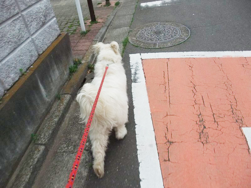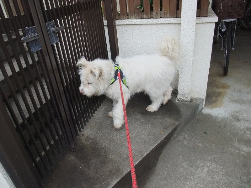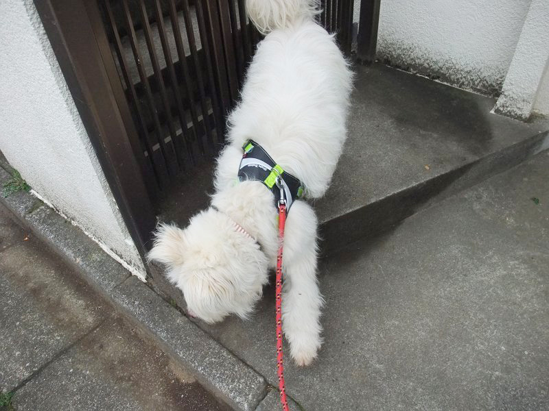 雨上がりの天気のせいなのか、いつもより10分ほど早かったからか、寝起きが良くなかったのか、夜の雨で熟睡できなかったのか、ハーネスがいやなのか、とにかく、なにがしか、気分が機嫌が良くなかったらしいです。