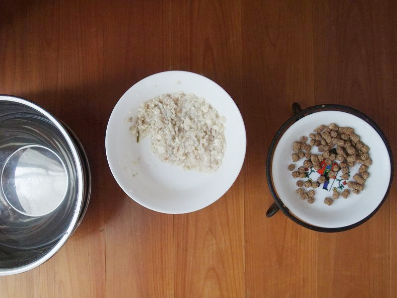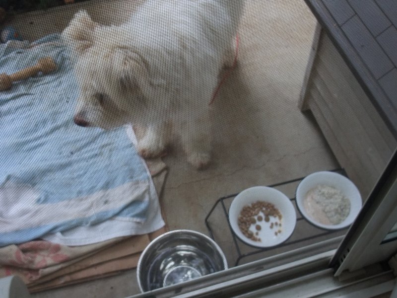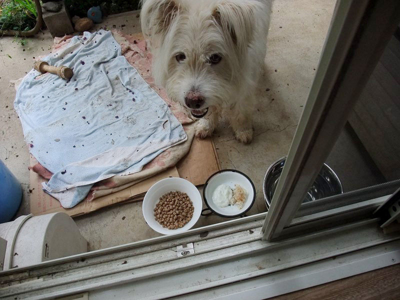 朝ご飯、また、ご飯と鳥挽き肉の「おじや」(リゾットではない)だけ食べて、カリカリは残しました。