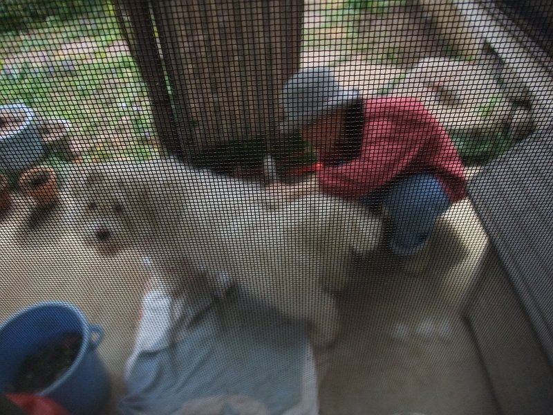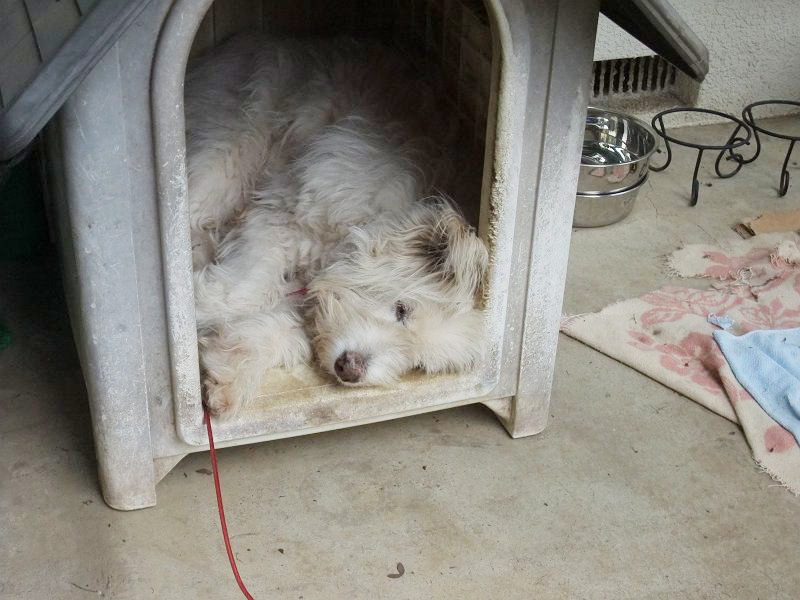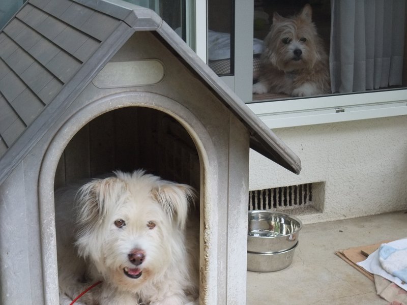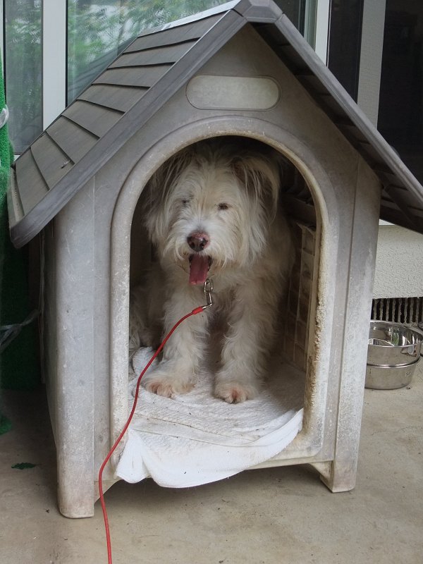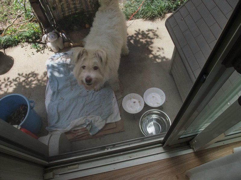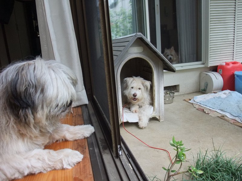 ハウスの中も暑そうですが、あまり出て来ないようにして、「今日も、散歩に行きたくないよ。」って主張しています。