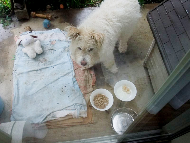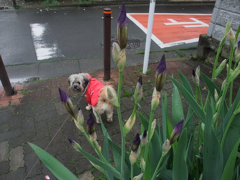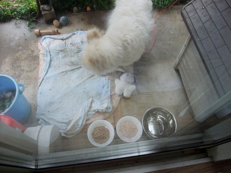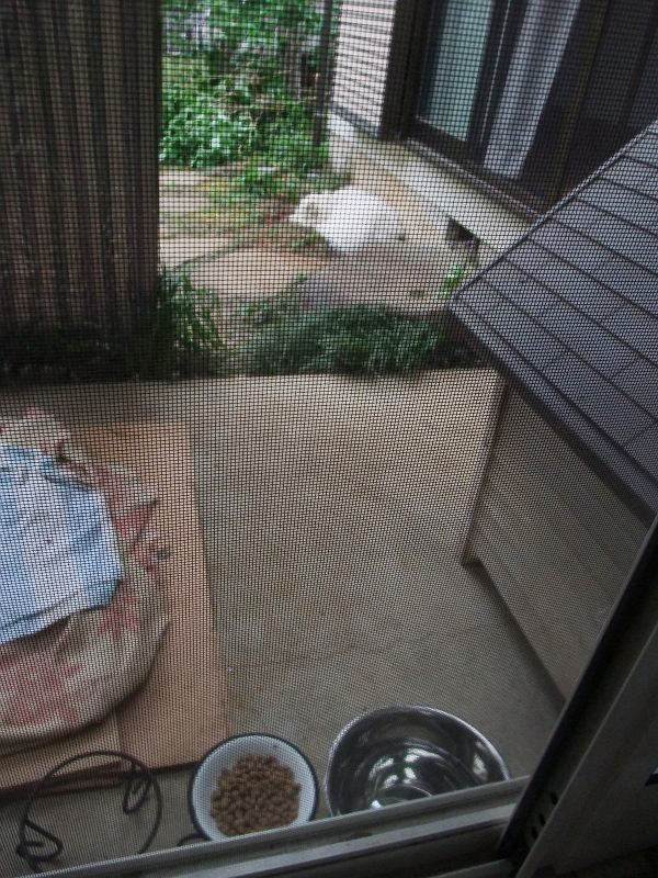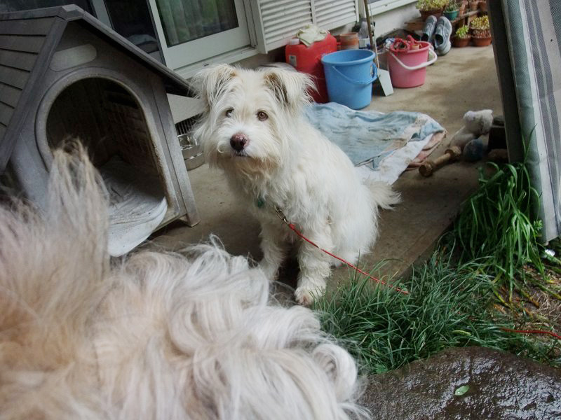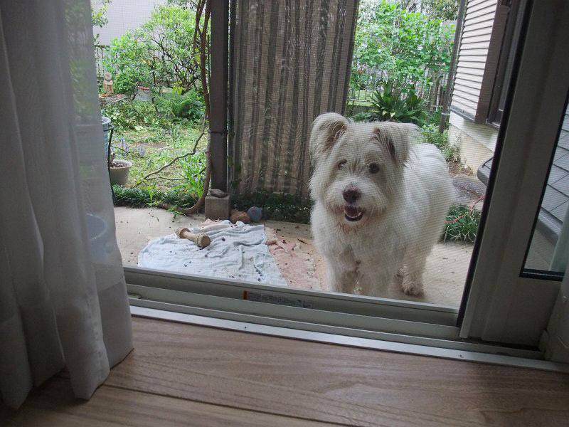 朝、なにかしてほしそうな顔で見ていたので、雨の中、庭をうろうろ。