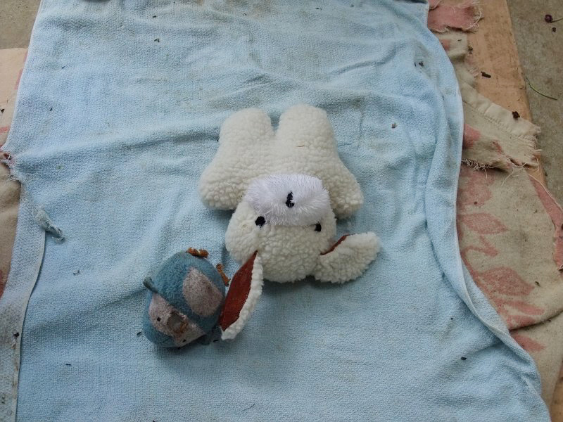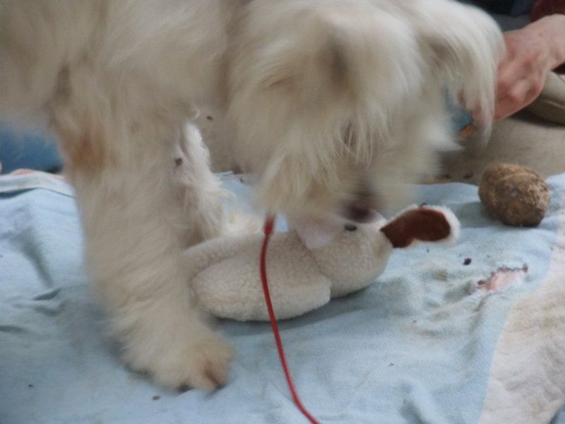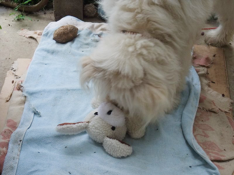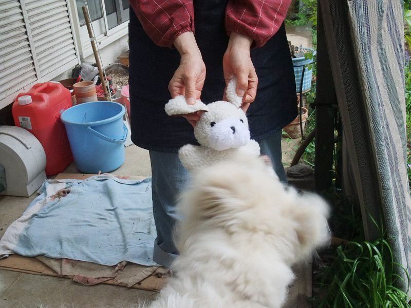 雨で散歩に行けずに、つまらなそうだったので、買っておいたウサちゃんをあげました。