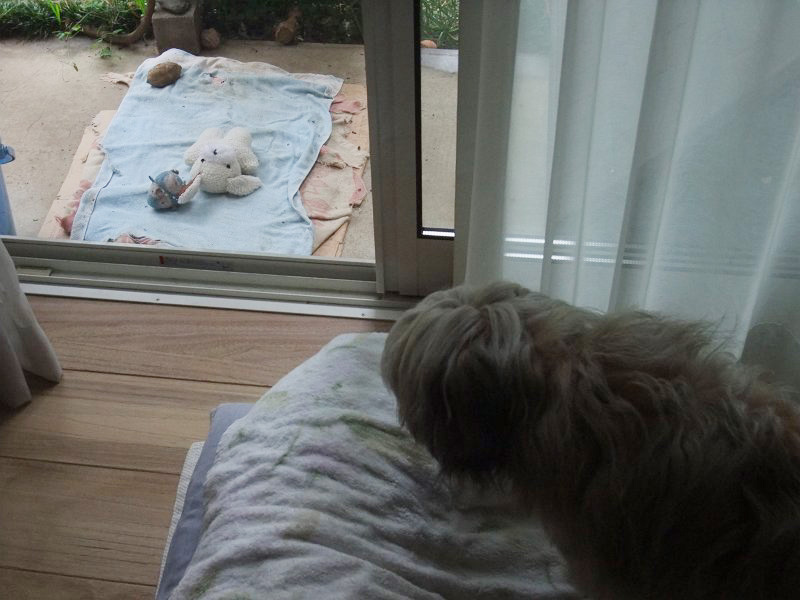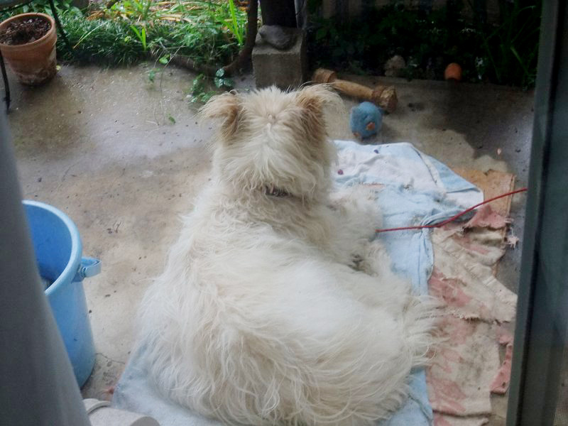 雨。 コロちゃん、何思う。。。