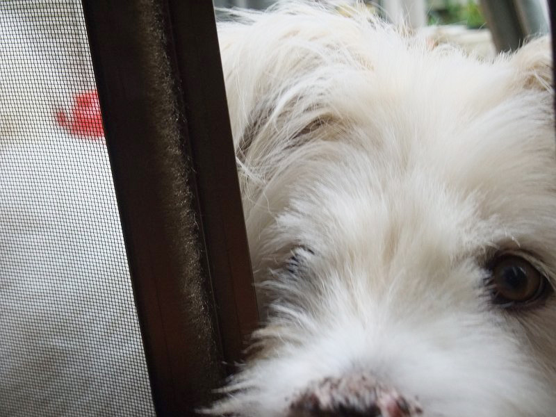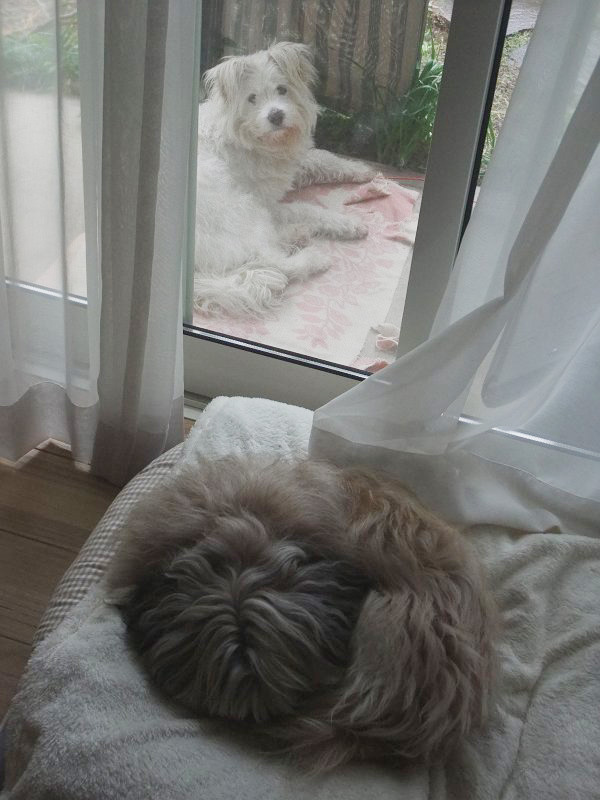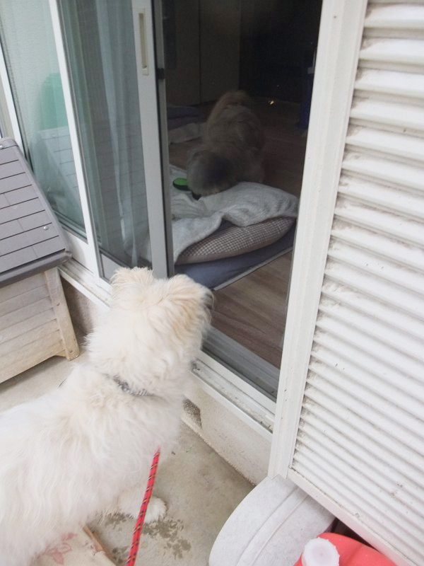 ラキピピがじゃれあったり、遊んでもらっていたりする様子を、窓に近づいて見ています。ちょっと、仲間はずれな感じを抱いているかもしれません。