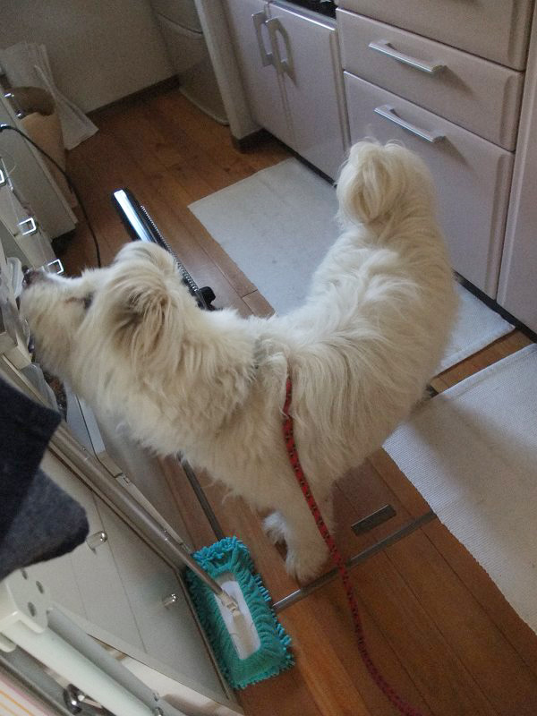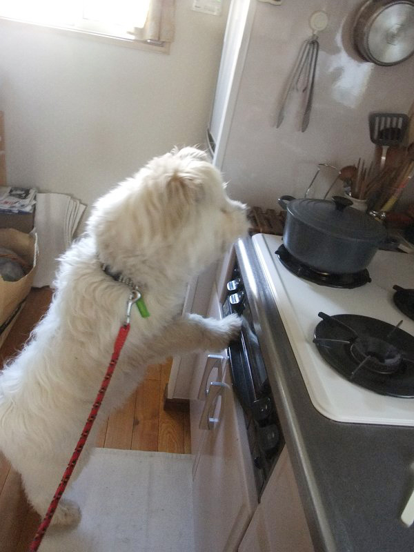 前回、ラッキーとの1回目の喧嘩の原因が台所にあった感じだったので、台所探索してもらいました。