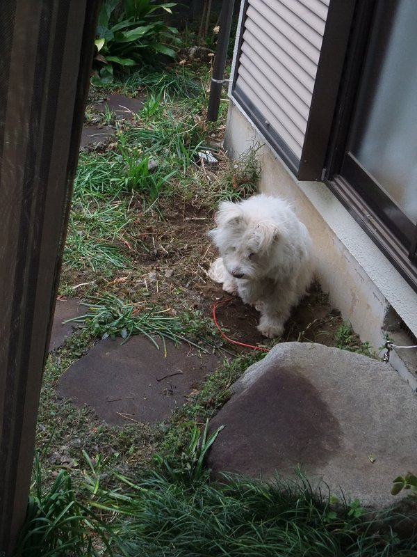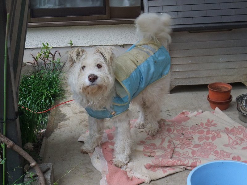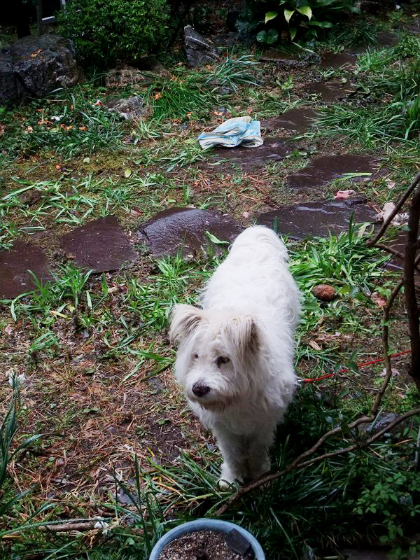 カッパを着せられてるし、雨降ってるし、もともと散歩嫌いだし、変な格好してるし、で、不安と不信感でいっぱいになっていたのだろうと思います。