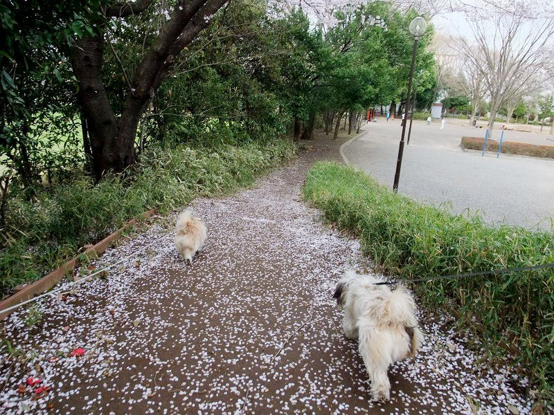夕方、桜の花びらを踏みしめて、仲良くお散歩。