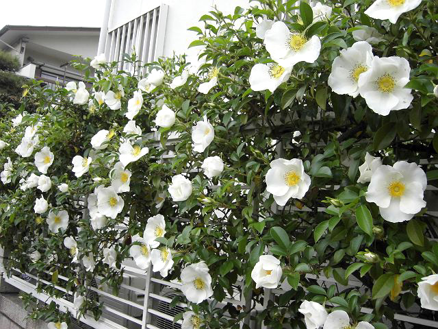 一重のバラ?が垣根にきれいに咲きそろっていました。
