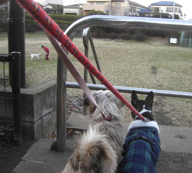 [遠くで ”もってこい” 訓練中のラブちゃんが、うらやましくて仕方がありません]