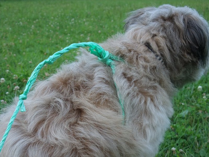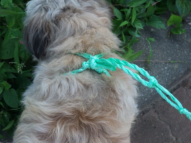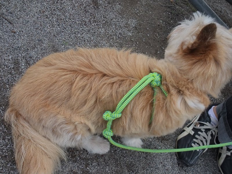 コロちゃんには、荷造りロープで作ったリードを付けてあります。