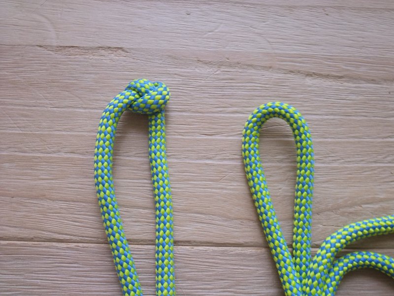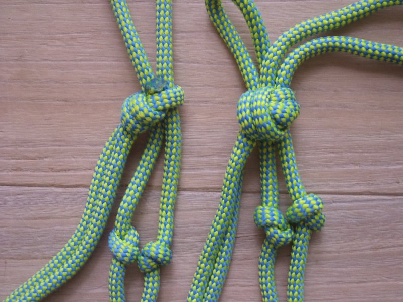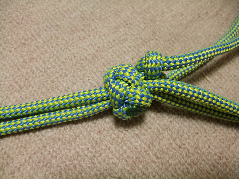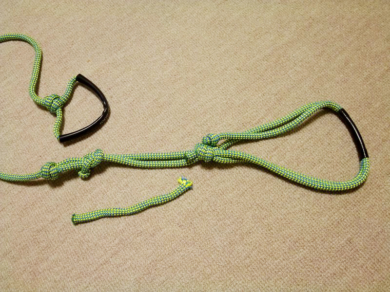 荷造りロープで手作りした経験でもって、ほどいて、結び目を小さくしてみました。