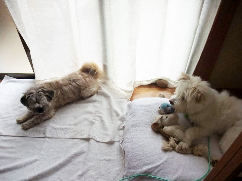 コーギー×シーズーmixのラッキーと、ラサ・アプソmix?のピッピ。