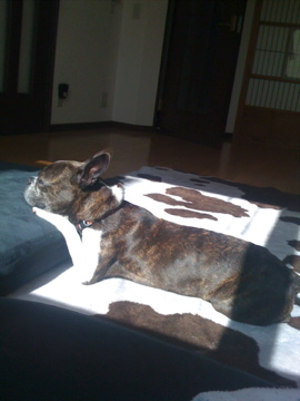日向ぼっこの姿、あごの下にお手々を入れる得意のポーズ。