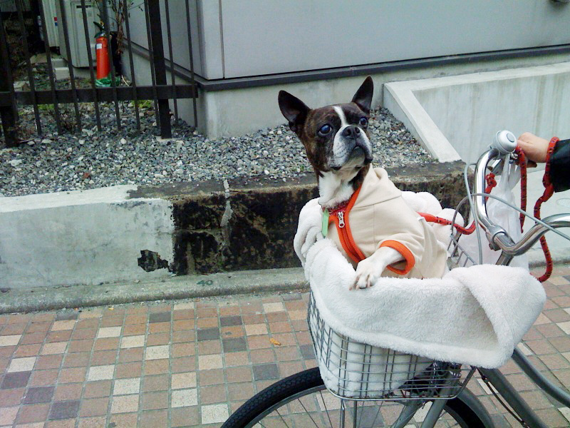 自転車の前かごに乗せてもらって、きょろきょろ、うれしそう。