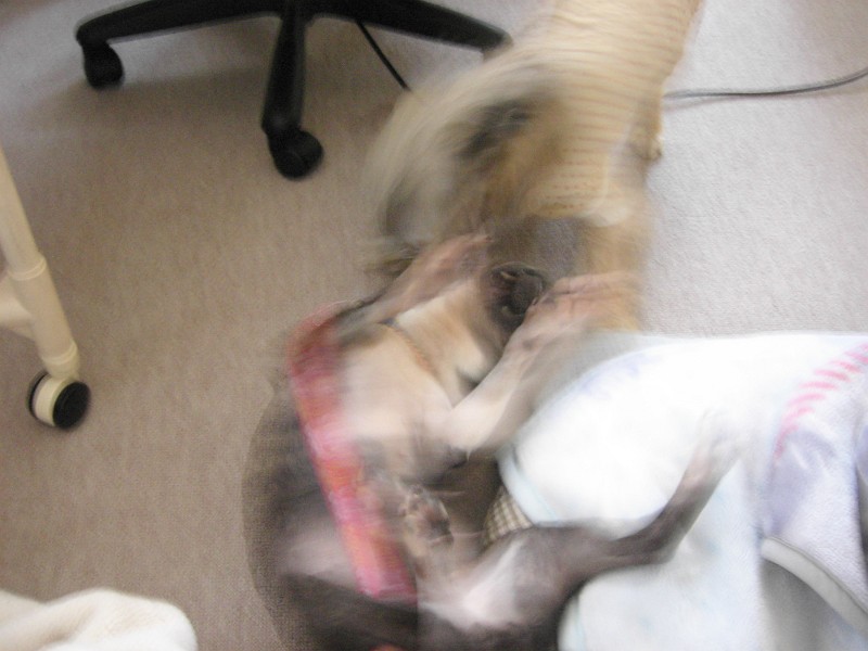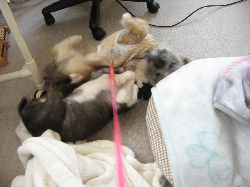 今日はたくさん遊んだので、今は自分の寝床に私たちの服を持ち込んで寝ております。