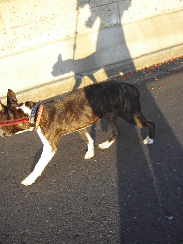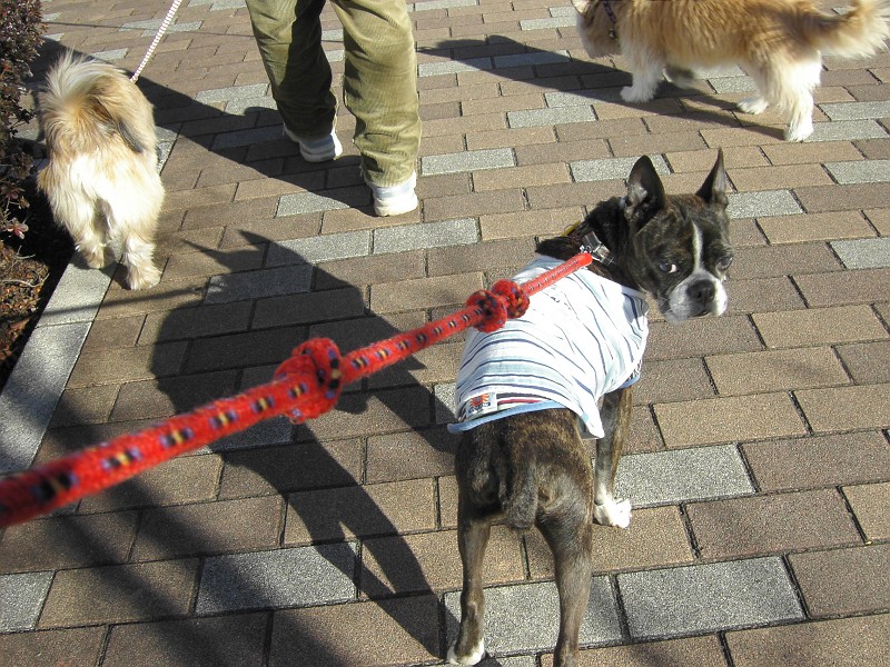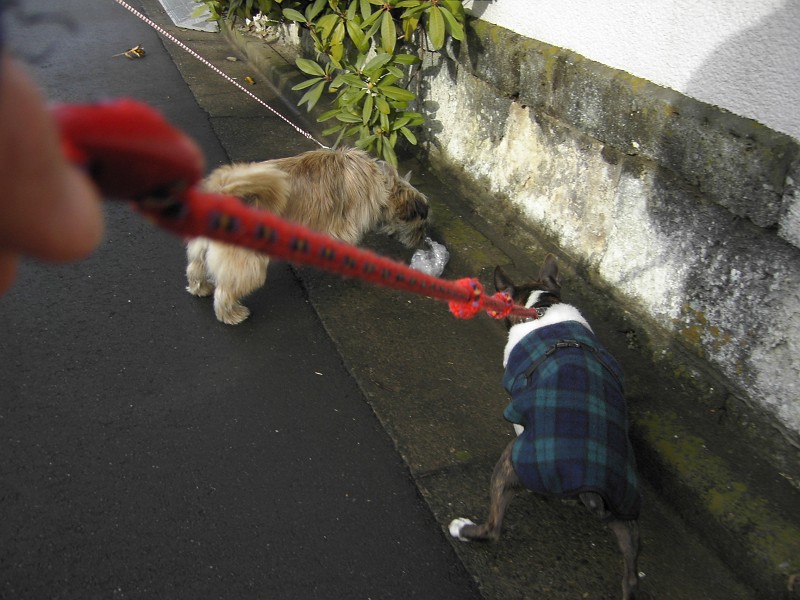 拾い食い防止訓練、「付け」訓練をしながら、のお散歩です。
