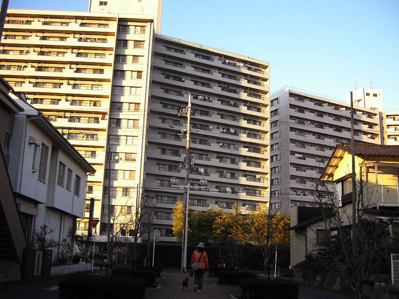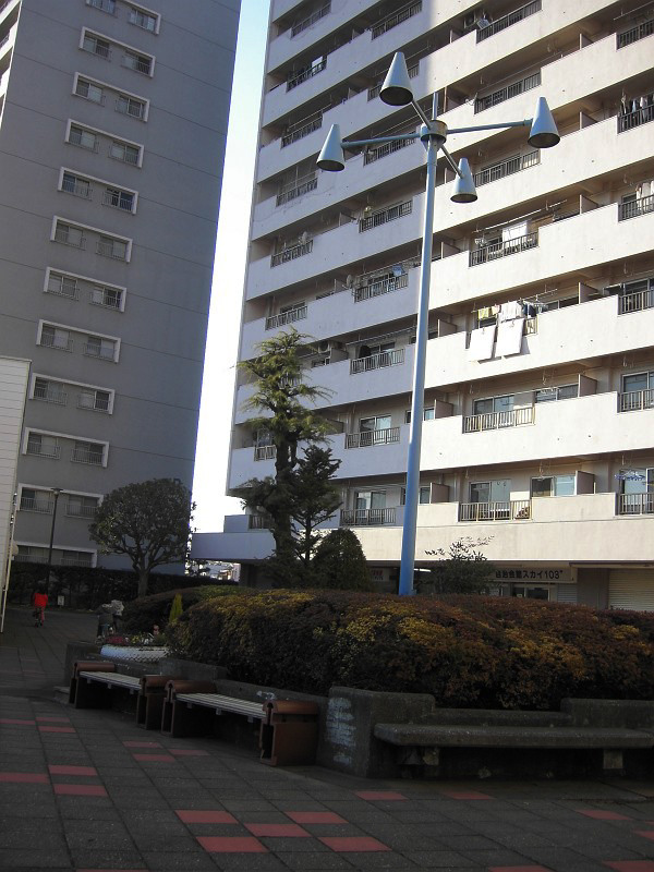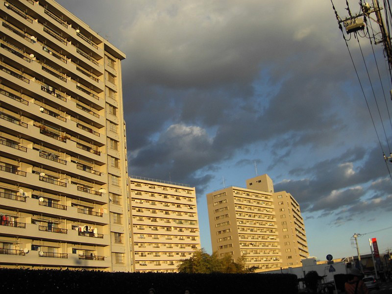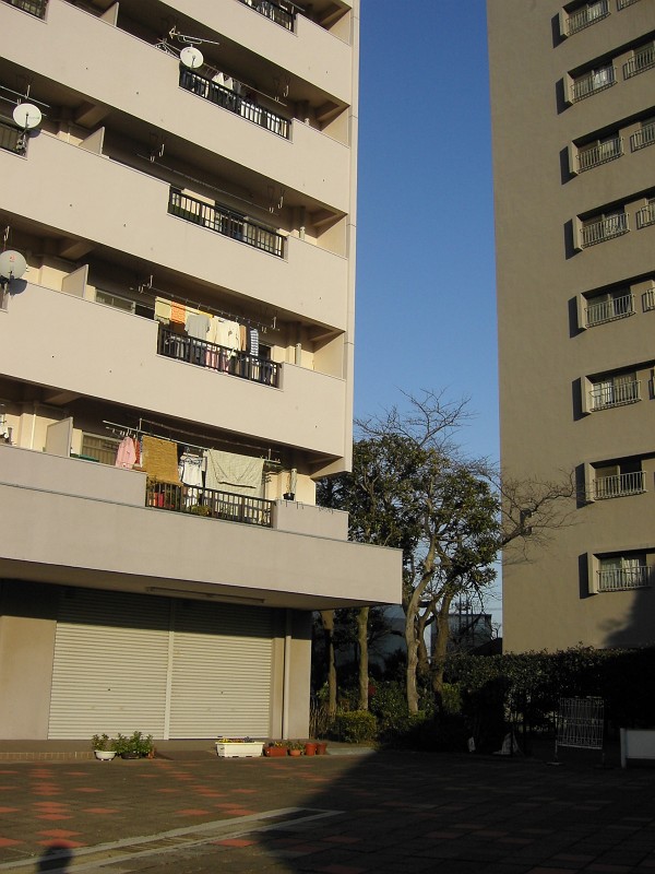 マンションの間の隙間の道は、ものすごい風。