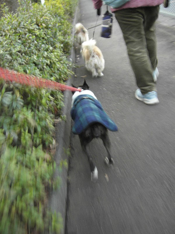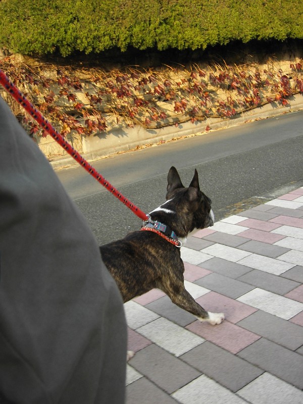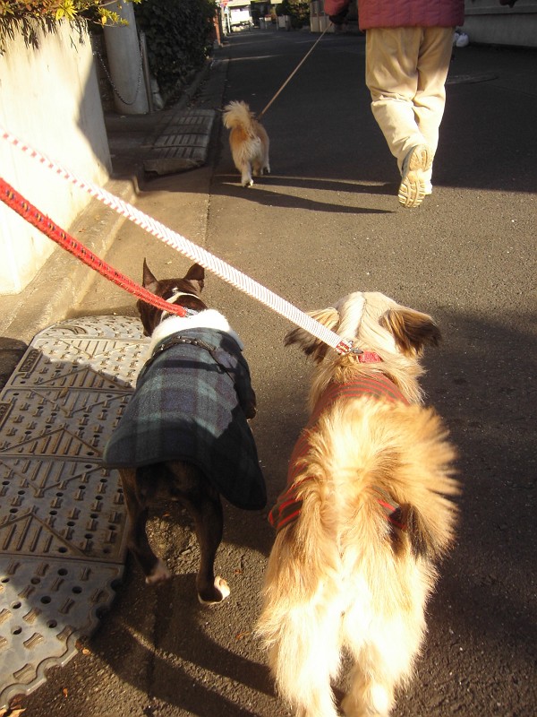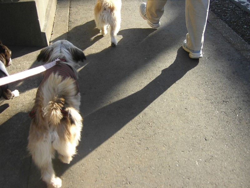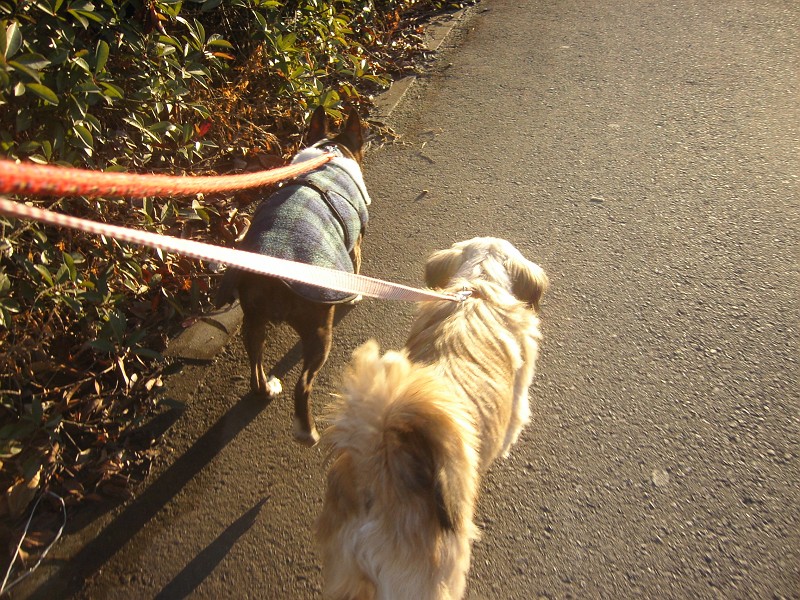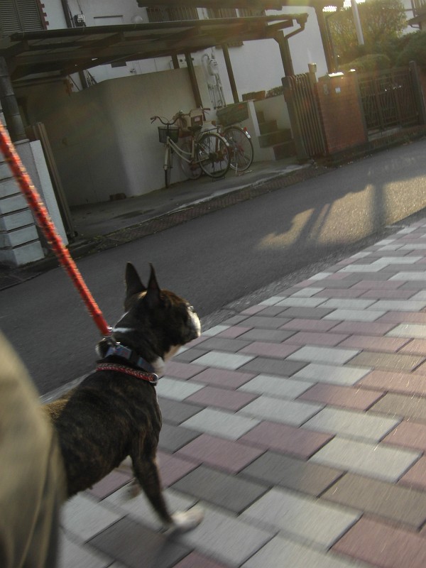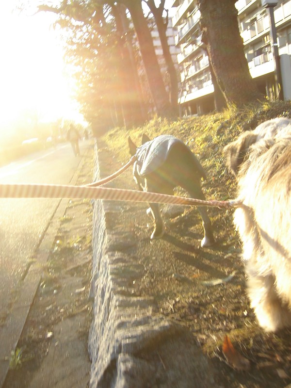 朝陽をいっぱい浴びて、グイグイ引っ張る、ラッキーちゃん