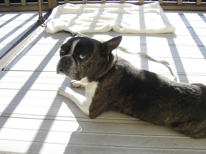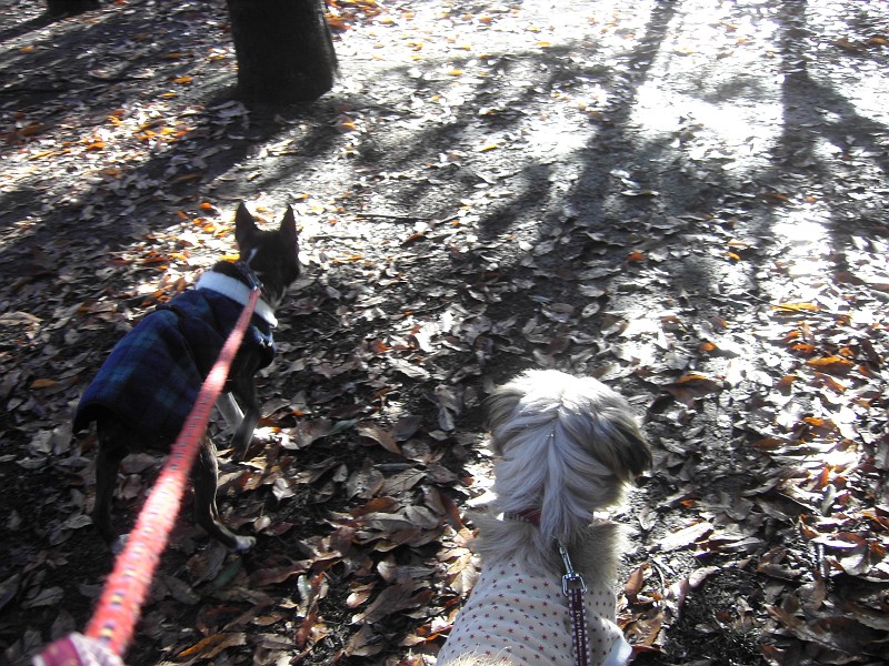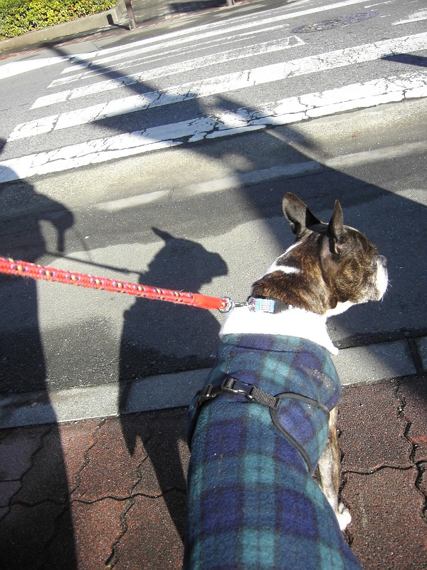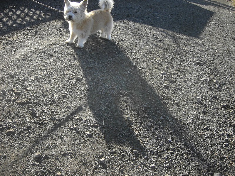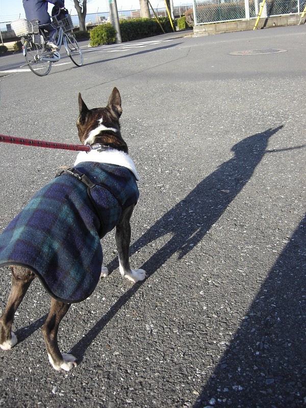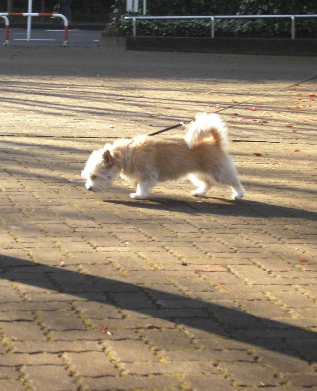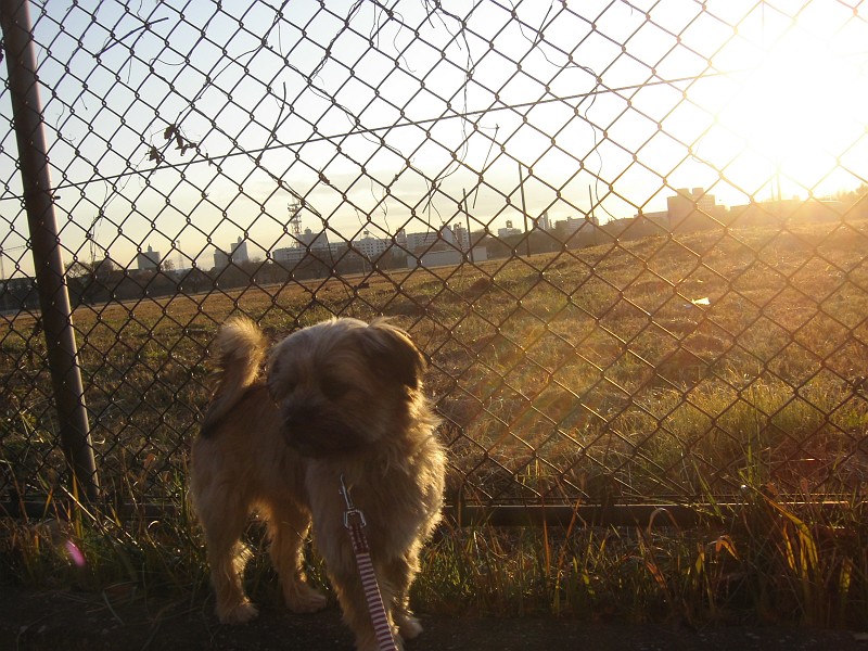 朝陽をいっぱい浴びて、グイグイ引っ張る、ラッキーちゃん