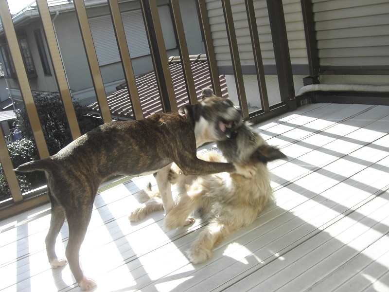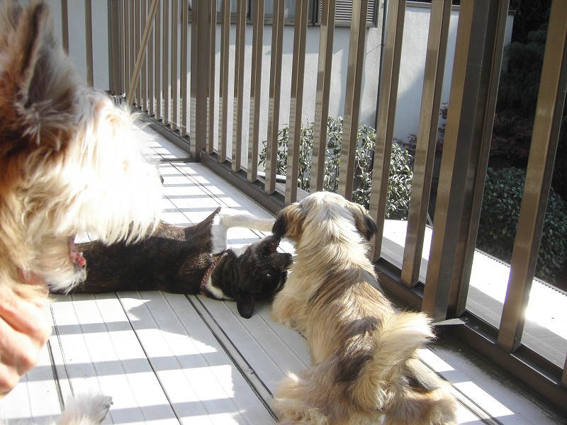 ラッキーは、まりもに近寄られると、小さなうなり声をだしますが、「だめ」と言えばおさまるので、まりもも攻撃をしません。