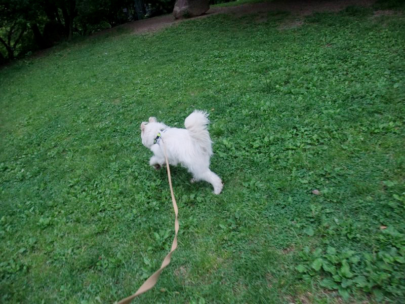 散歩しているワンちゃんが少ない時間帯らしいけど、コロちゃんは、見かけると、挨拶しようと、近づこうとします。