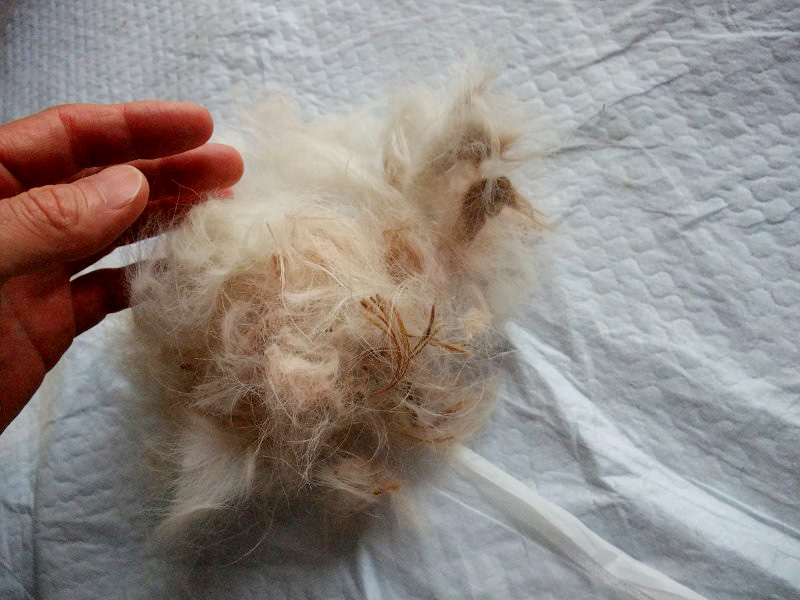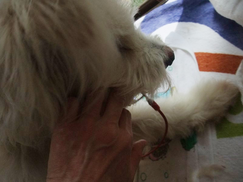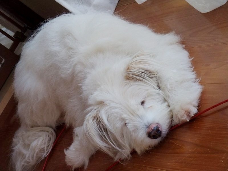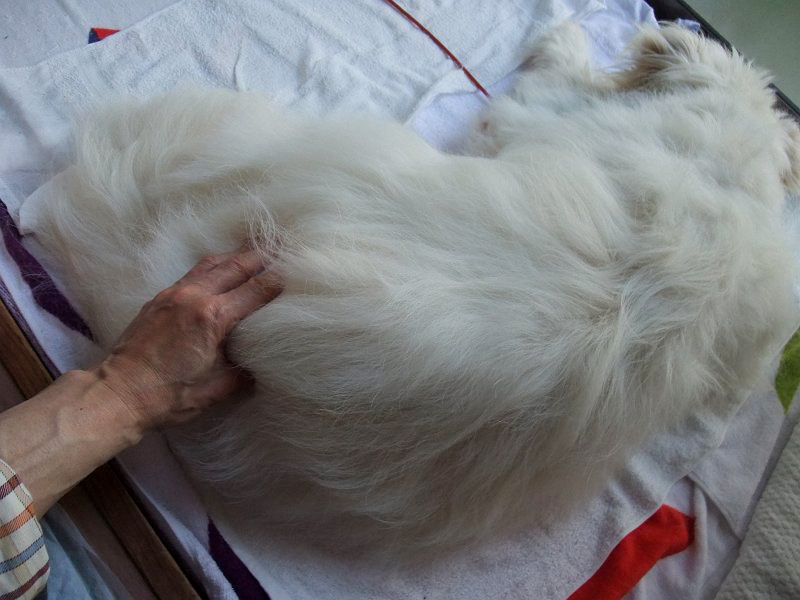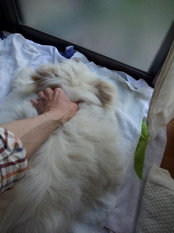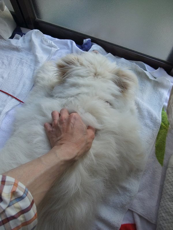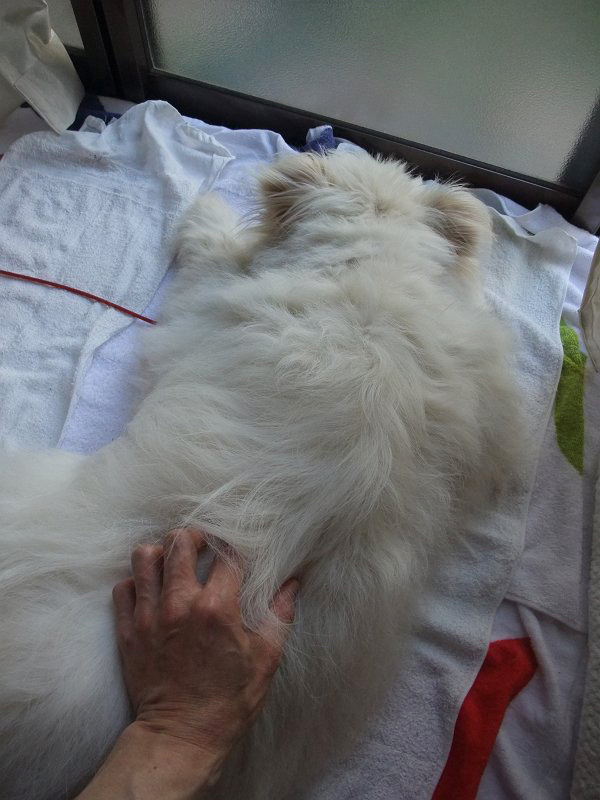 で、コロちゃんが、横座りして、おまたを舐めているときに、話しかけながら(いろいろな状況で、話しかけながらするようにしています)、後ろ足の付け根(おちんちんの周辺)あたりにいくつもできている、堅くなった大きい毛玉を、丁寧に、時間をかけて、慎重に切除しました。