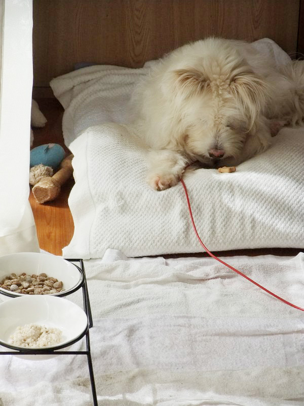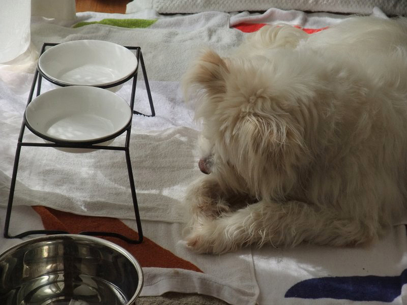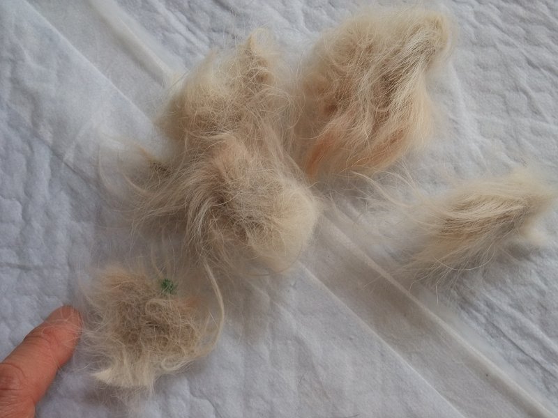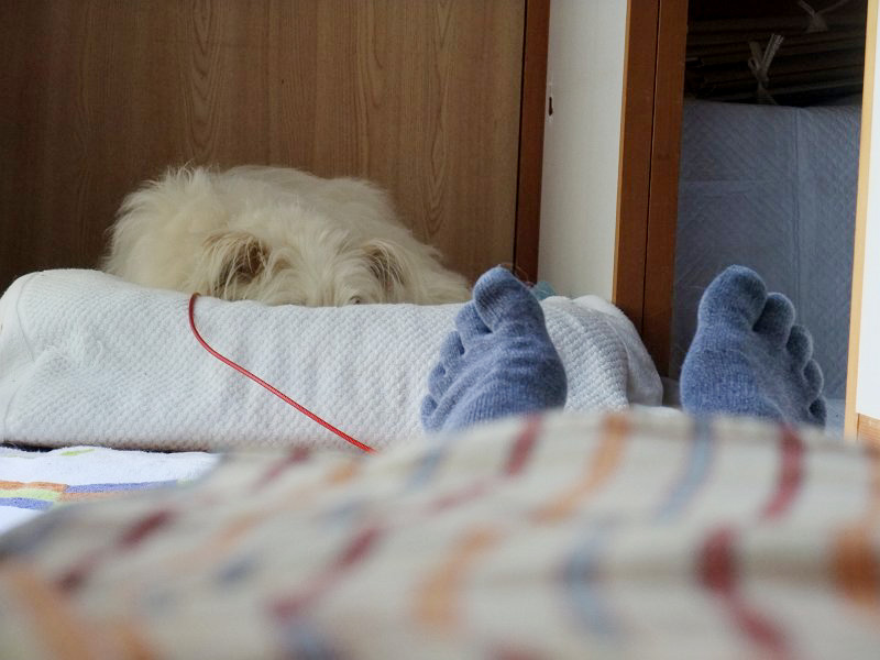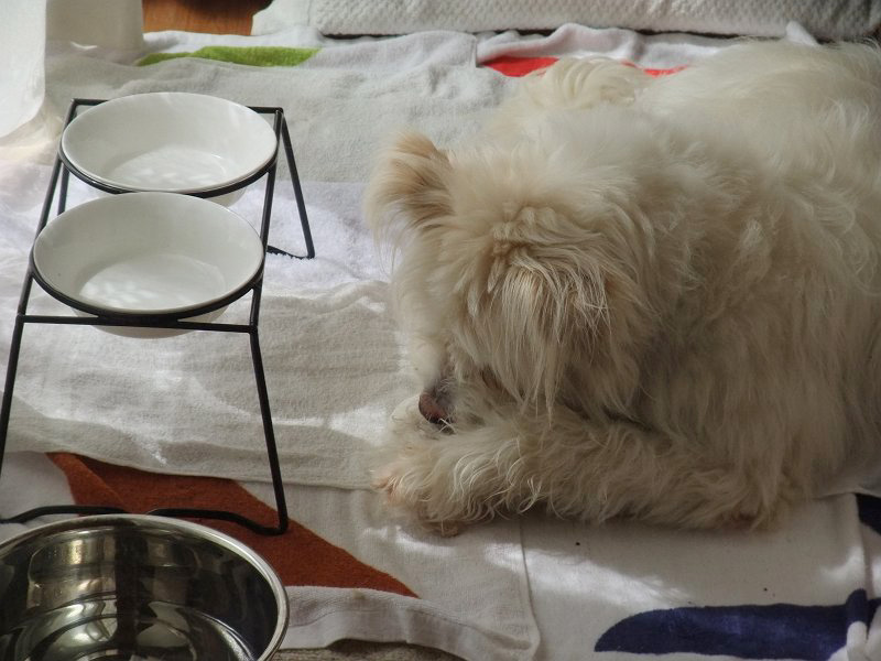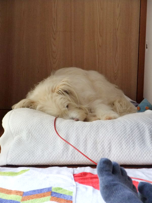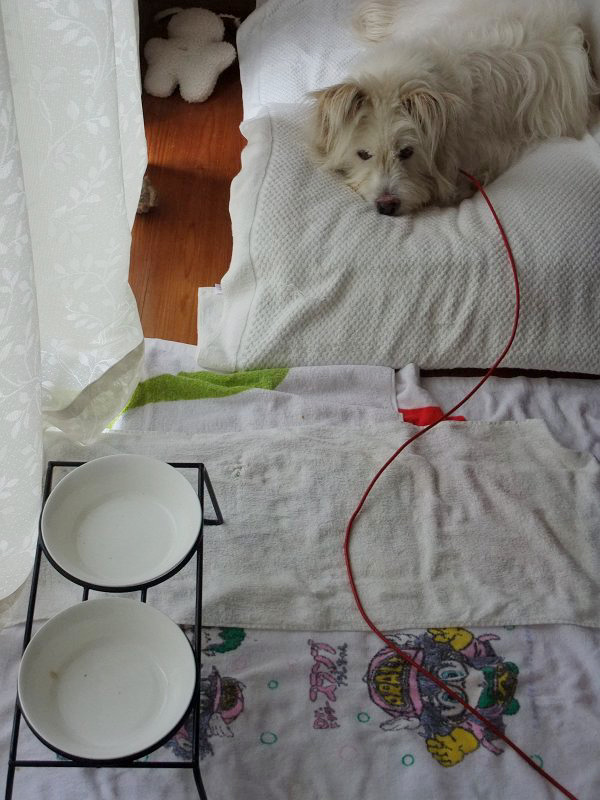 で、コロちゃんが、横座りして、おまたを舐めているときに、話しかけながら(いろいろな状況で、話しかけながらするようにしています)、後ろ足の付け根(おちんちんの周辺)あたりにいくつもできている、堅くなった大きい毛玉を、丁寧に、時間をかけて、慎重に切除しました。