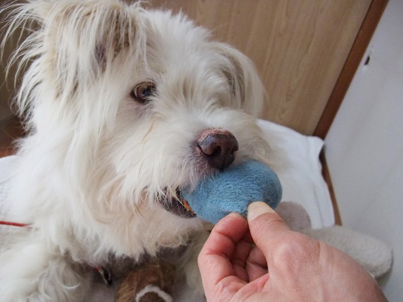 ピーピーおもちゃで誘ったりして、遊ばせました。